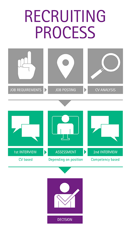Biểu đồ thể hiện các bước cơ bản của quy trình tuyển dụng. Tất nhiên, điều này sẽ có sự khác nhau giữa các quốc gia. Sau khi bạn nộp đơn ứng tuyển, bộ phận Nhân sự tại địa phương của chúng tôi sẽ liên hệ và cung cấp thông tin chính xác cho bạn về quy trình tuyển dụng đối với trường hợp của bạn.